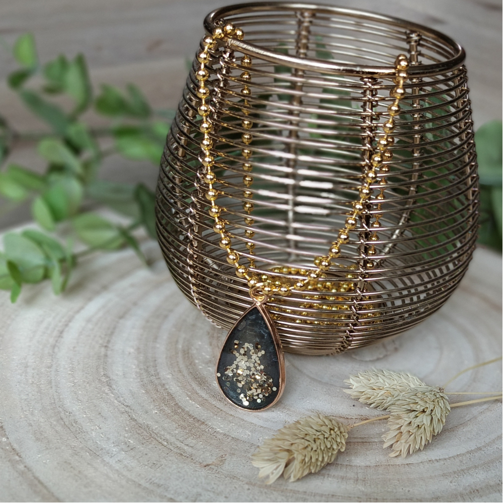 De goudkleurige, druppelvormige hanger (3,5cm lang) is gevuld met epoxy in een zwarte kleur en champagne kleurige glitters. Voorzien van een 80cm goudkleurige ballchain halsketting.