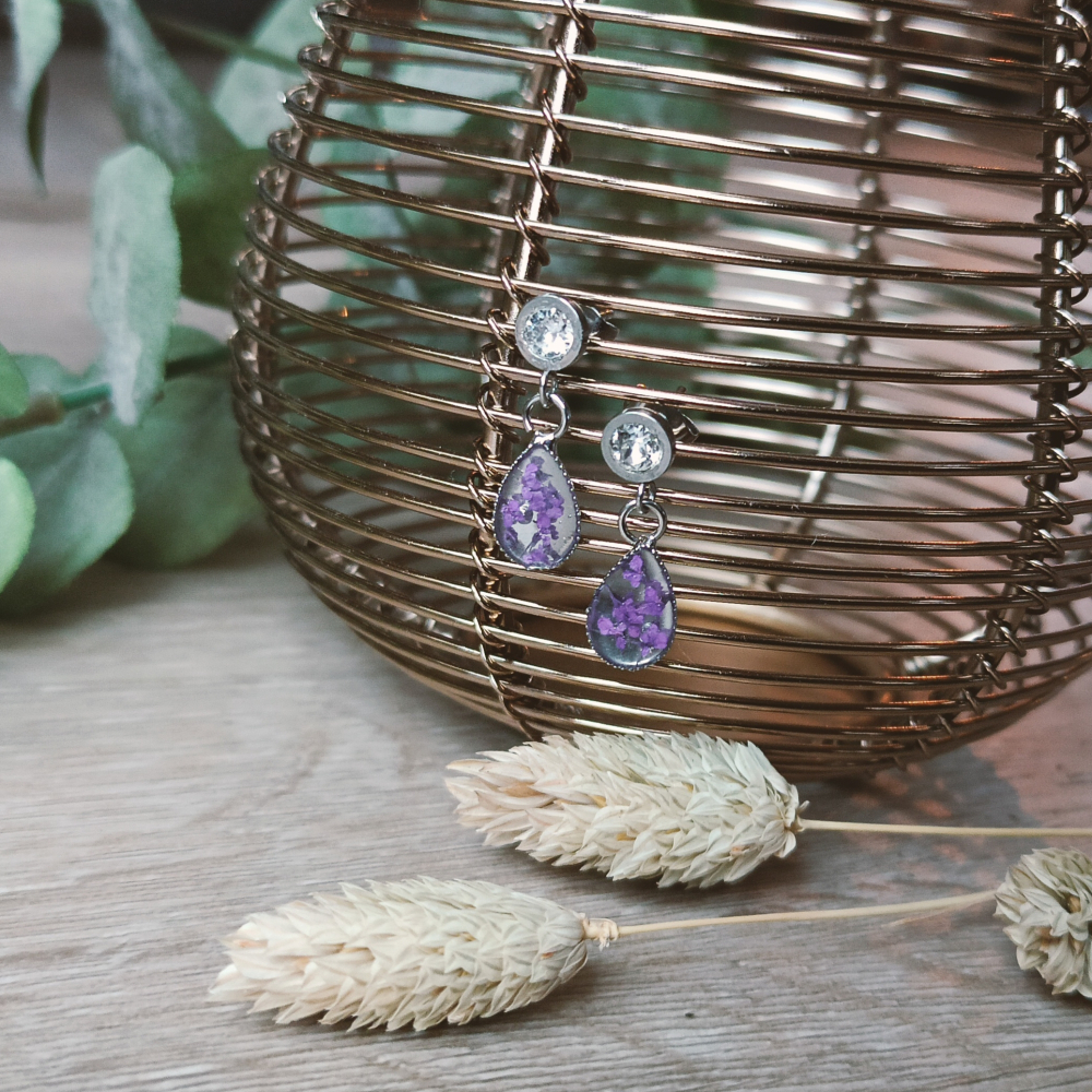 Het druppeltje zelf is ongeveer 1cm lang. Gevuld met epoxy en kleine paarse bloemetjes.