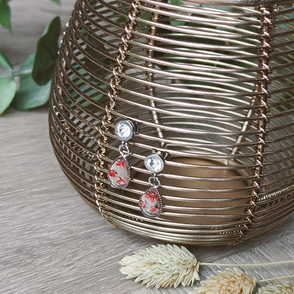 Het druppeltje zelf is ongeveer 1cm lang. Gevuld met epoxy en kleine rode bloemetjes.