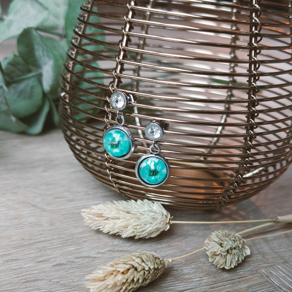 Deze oorknopjes van rvs hebben een zilverkleurig hangertje gevuld met epoxy en een klein lichtblauw gedroogd bloemetje op een lichte achtergrond.