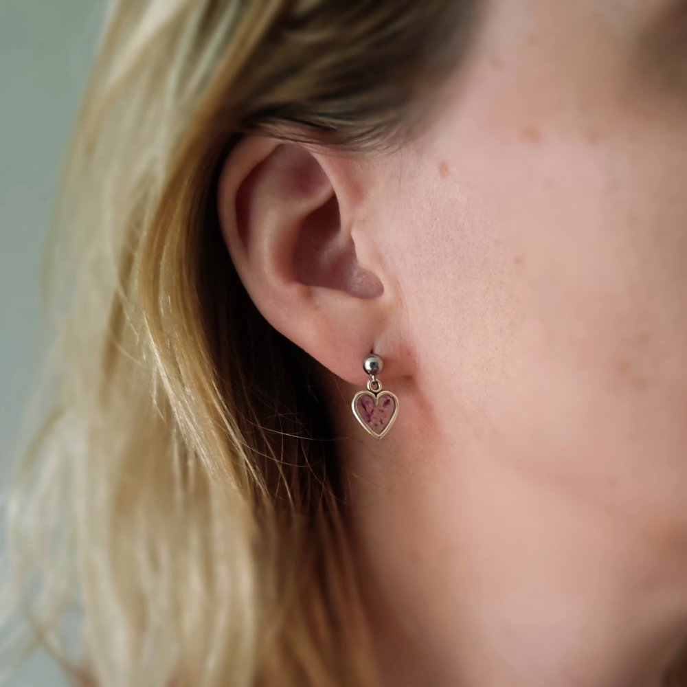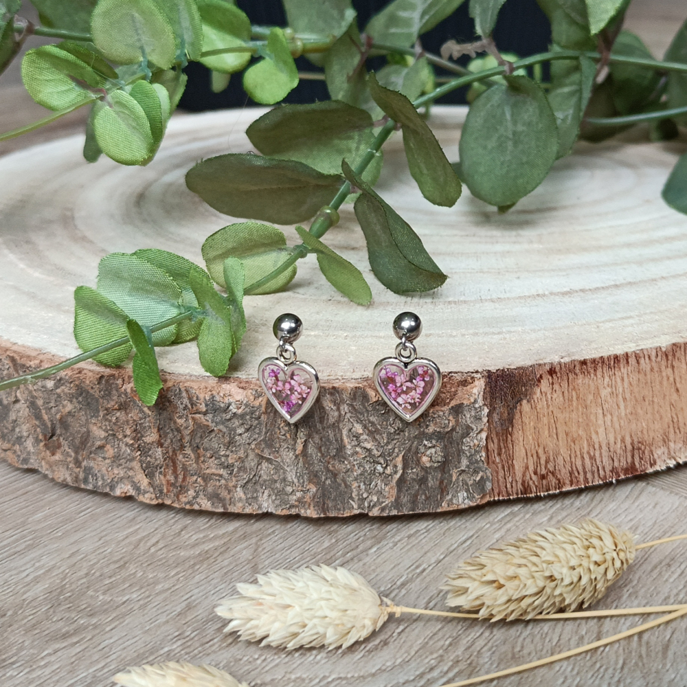 Deze schattige hartjes zijn ruim 1cm en gevuld met epoxy en paarskleurige mini gedroogde bloemetjes.