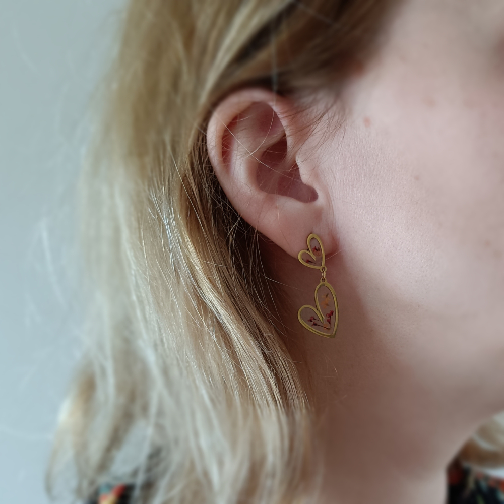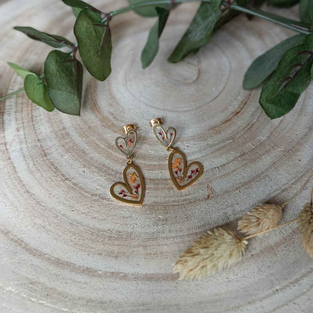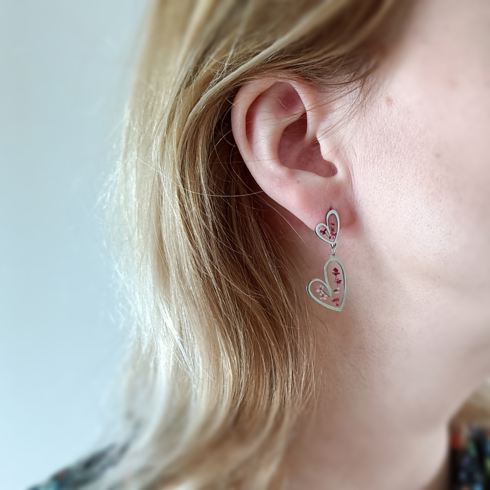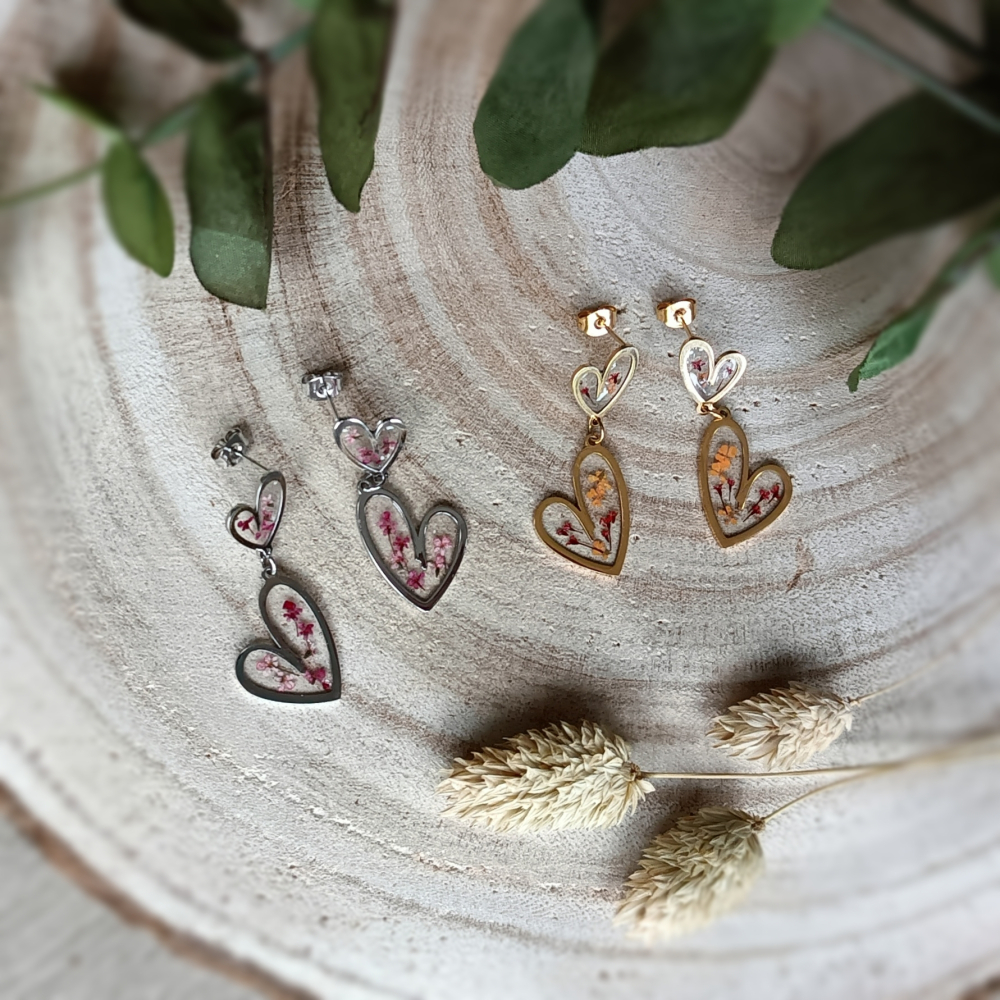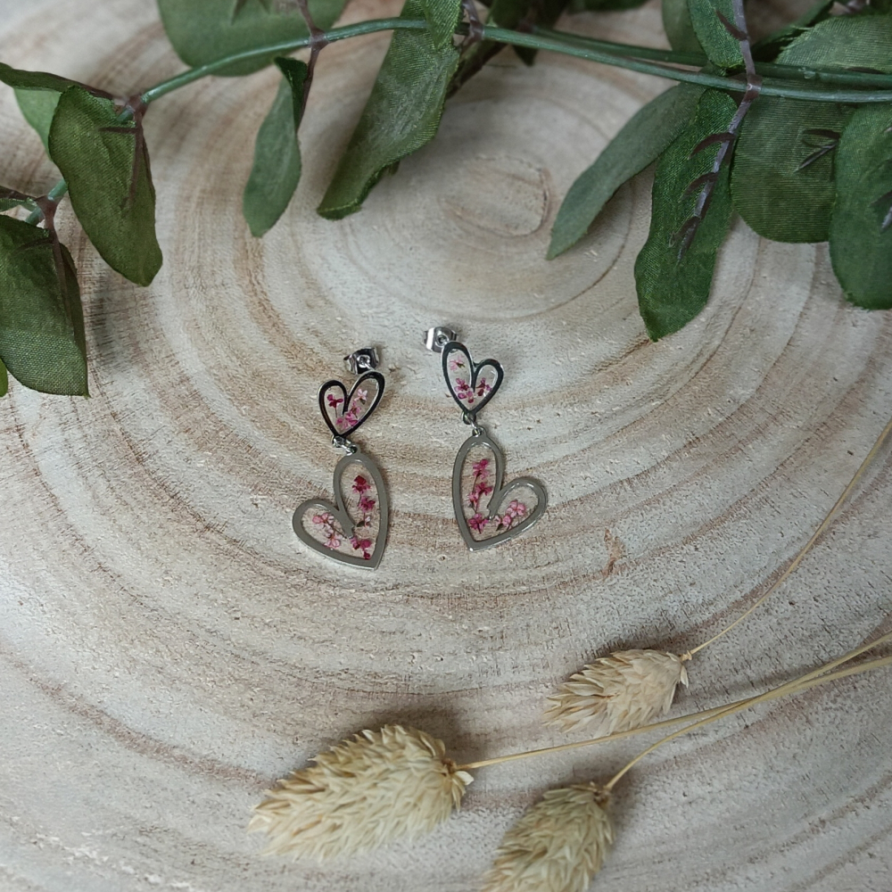 Deze leuke dubbele harten hangers zijn gevuld met epoxy en gedroogde kleine bloemetjes.