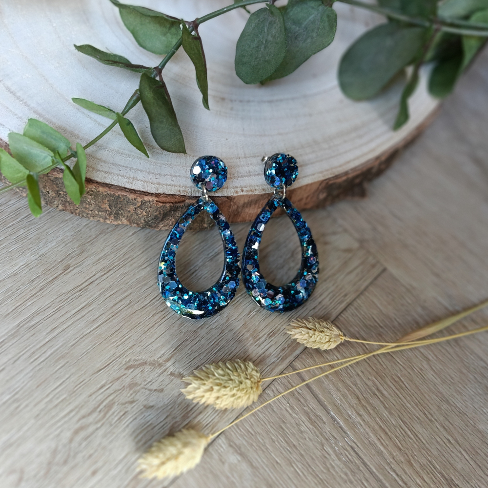 Ze zijn ruim 6cm lang en gemaakt van epoxy met blauwe glitters er in verwerkt.
