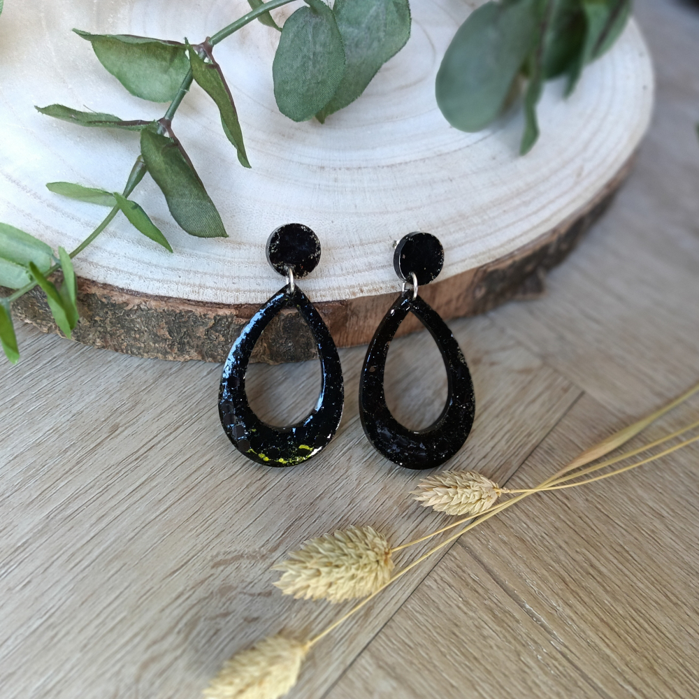 Gemaakt van epoxy met zwarte glitters er in verwerkt.