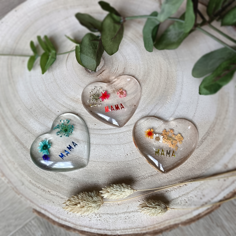 Laat haar weten dat je veel van haar houdt met dit lieve wenshartje van epoxy gevuld met gedroogde bloemetjes en het woord "mama".